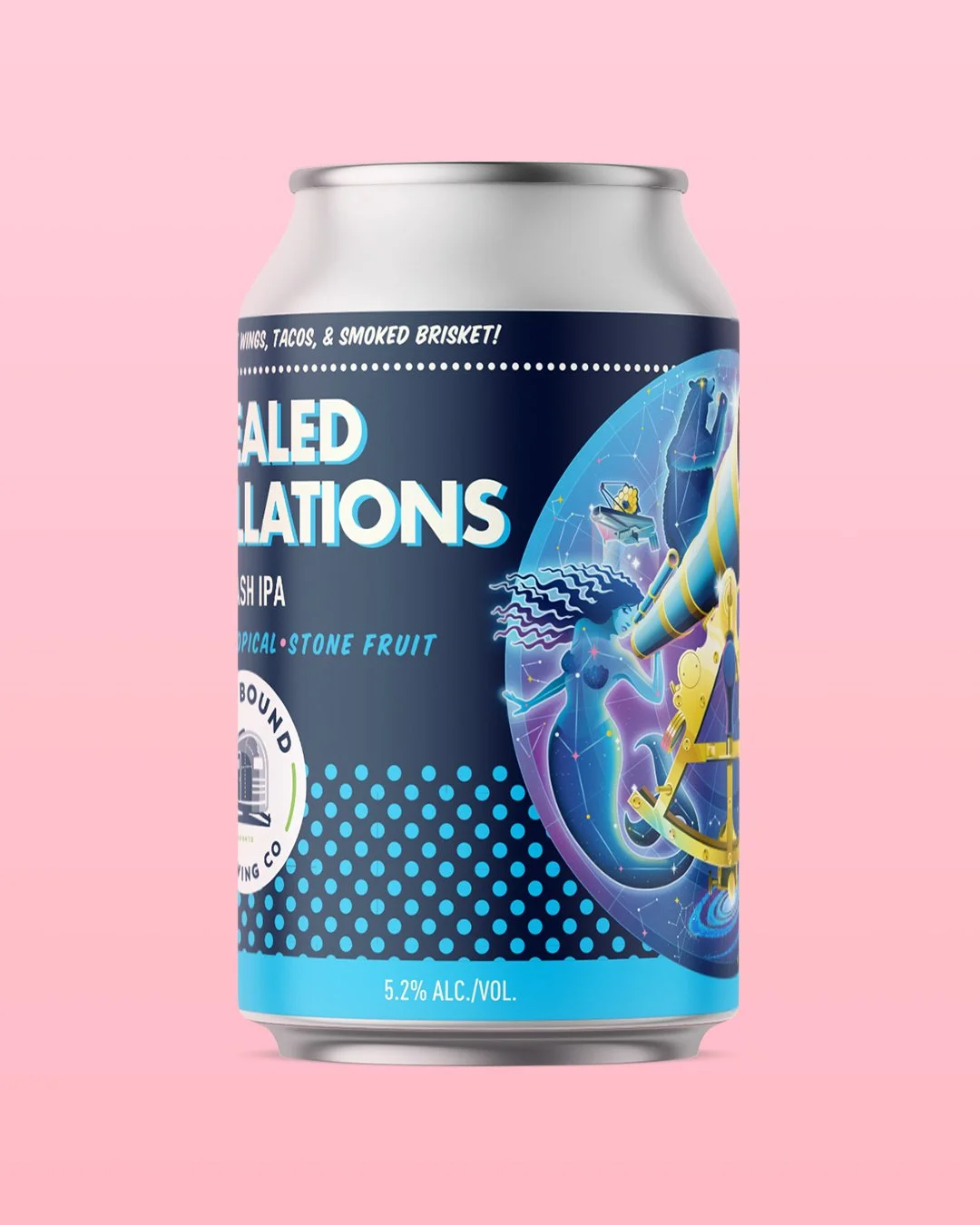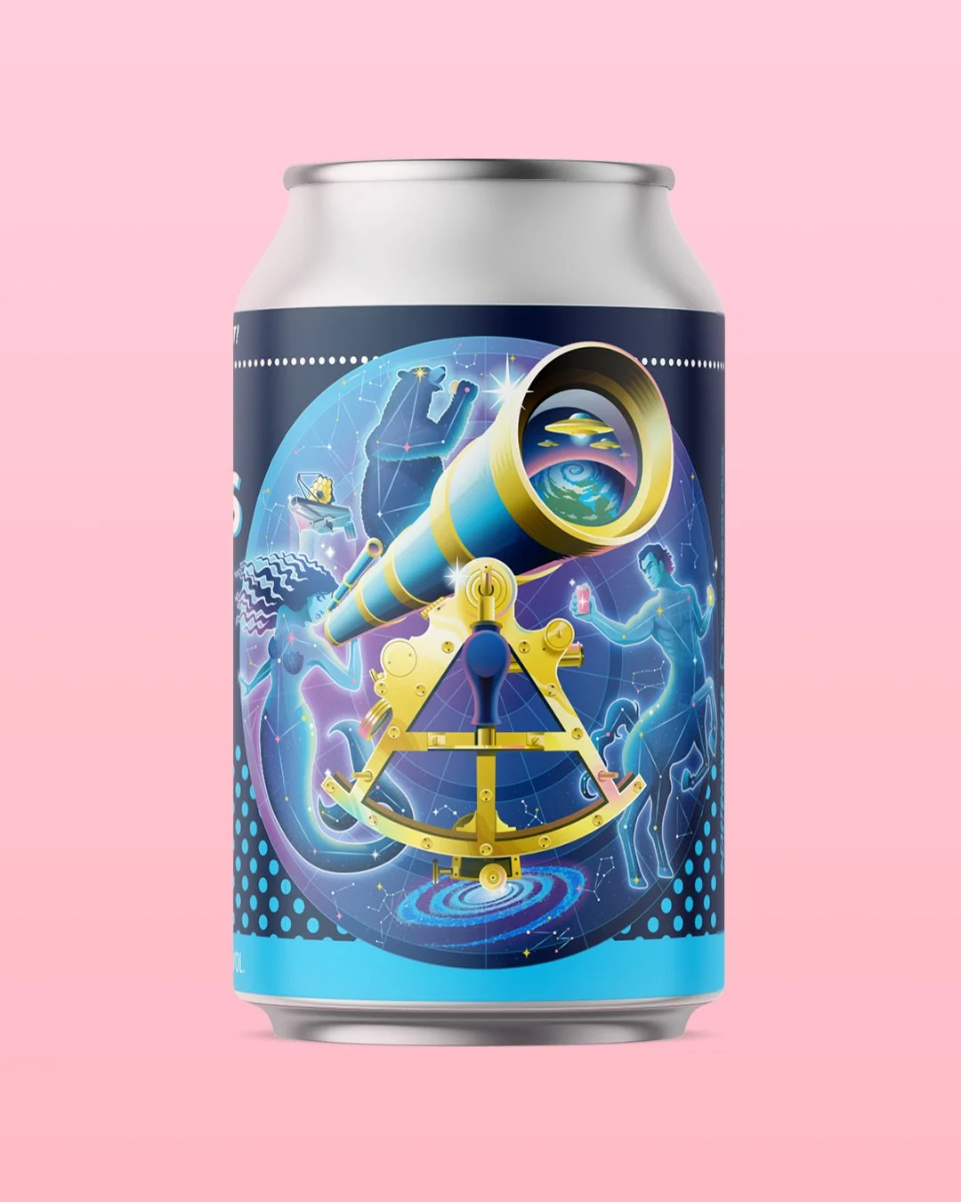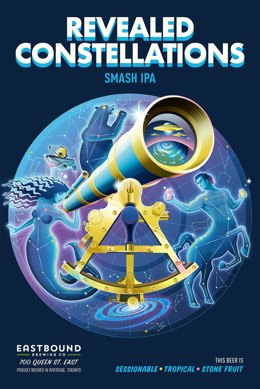 Mermaid spies UFOs while horseman offers beer in Revealed Constellations for Eastbound Brewing Co.